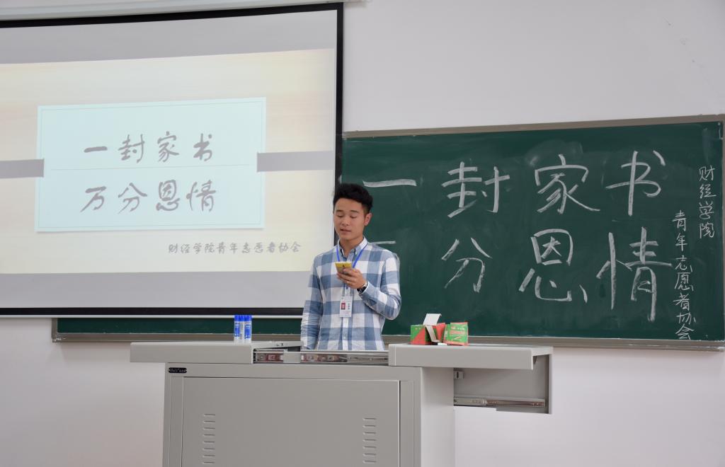2018年4月21日10:30,由财经学院青年志愿者协会举办的“一封家书,万份恩情”融情致信活动在C栋416室展开,此次活动让同学们把心里话吐露到笔墨上,寄给远方的父母。