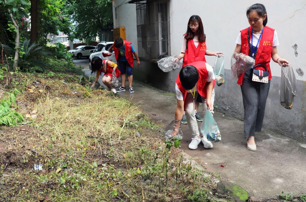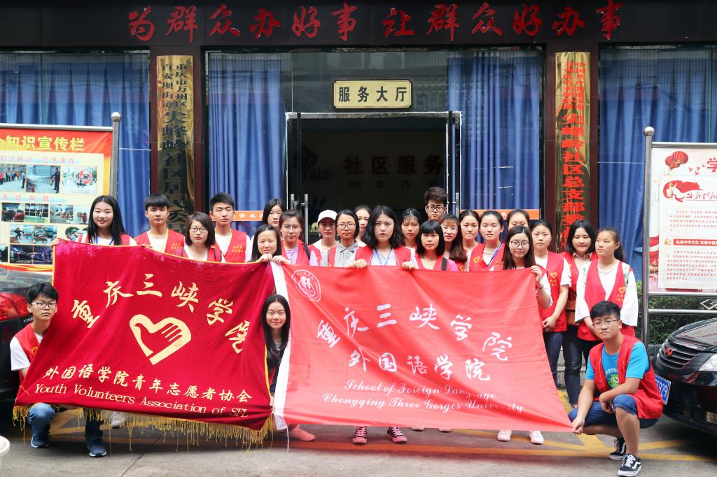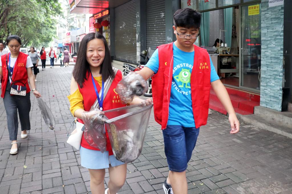 5月19日8:00,外国语学院青年志愿者来到百安坝街道尖峰岭社区与社区居民一起开展“除牛皮癣,树文明风”社区清洁活动。