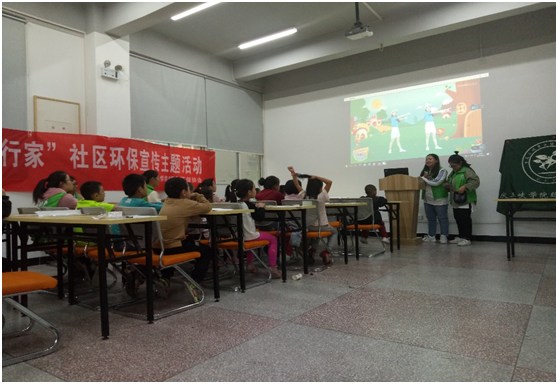 志愿者分为两队,一队志愿者负责在社区内宣传环保知识,并带领小朋友参与“环保小行家”课堂;另外一队则负责教室布置、游戏会场布置、小朋友签到、多媒体设置等工作。