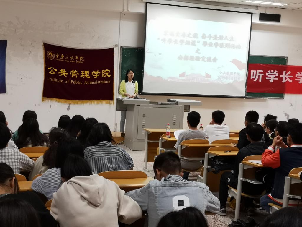 为了加强大家对考研的了解,为2016级有志于参加研究生考试的同学传授经验,同时营造公共管理学院积极向上的学风,公共管理学院于2019年5月13日在2教204举办了“听学长学姐说”毕业季系列活动之考研交流会。此次交流会邀请了我院辅导员杨杨,以及考研成功的2015级学生罗敏、姜敏桢、白雪瑞张萍等学长学姐。2016级意向考研同学和部分大一大二同学参加。