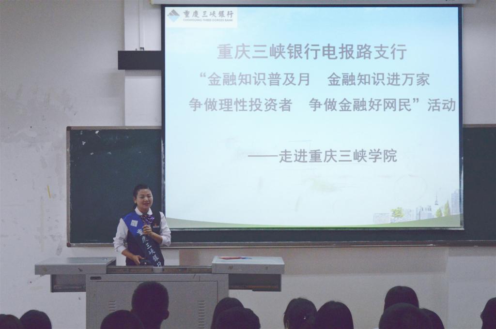 重庆三峡银行电报路支行行长助理邱敏受邀为大家普及金融网络安全知识。她以“网络安全,一路随行”为主题,从典型案例入手,围绕金融好网民行动指南、个人征信知识、远离校园不良网络贷款、电信网络诈骗防范技巧、2019年新版人民币知识五个方面,向同学们介绍了如何正确办理和使用银行卡及防二维码支付盗刷、产生不良信用记录的常见情况及影响、校园不良网络借贷的危害、辨别新版人民币的方法等内容。