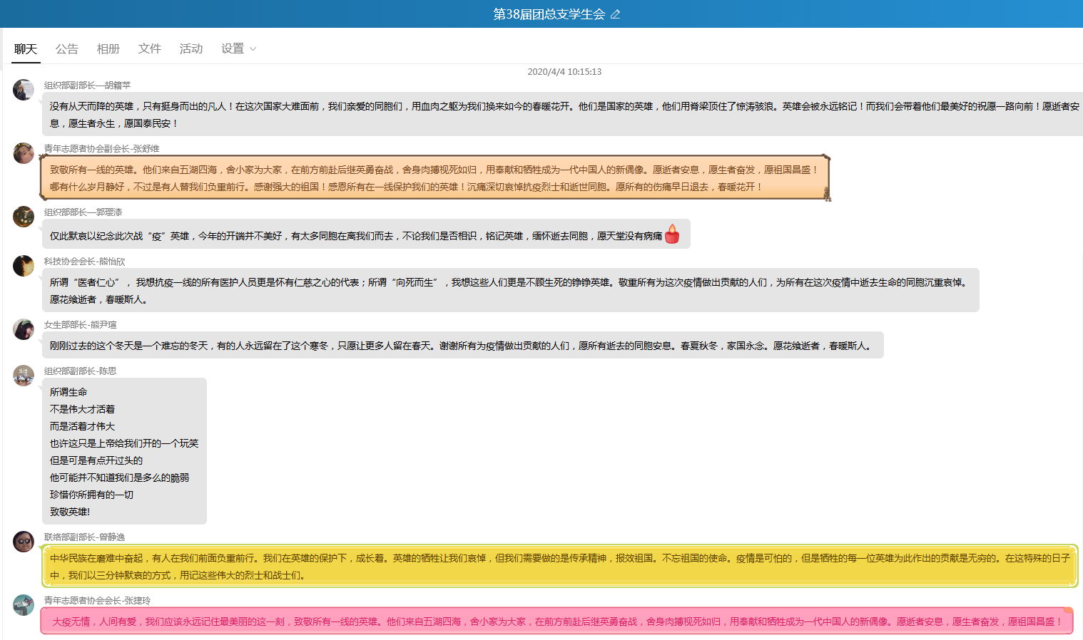 哀悼活动结束后,2018级英语一班团支书分享了自己的感想,他说:“渐渐开始明白没有什么比生命更加珍贵,也明白能献出生命的人有多么伟大,我们都很渺小,但伟大的人一直在闪闪发光,我们会继续前进,带着你们美好的憧憬。”我们此刻的安全是无数一线人员日日夜夜的努力换来的,我们不能一直停滞不前浪费他们的牺牲,我们应该带着他们寄予我们的希望奋勇前进。