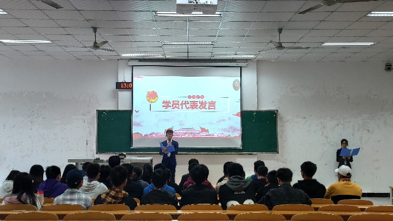 活动开始,全体起立,合唱《光荣啊!中国共青团》,随后,学员代表黄显诚发言,他说:“感谢学院为我们学习知识,增强素质,锻炼能力提供了一个良好的平台,通过‘青马工程’的磨砺,年轻的我们必将以最宽广的胸怀、最饱满的热情,投身到每一天的学习工作中,去憧憬更为辉煌灿烂的明天!”团总支(学生)副书记陶政炜宣读青马工程学员手册,并对培训安排做大致说明,希望大家能够学有所得、学以致用、学以实用。