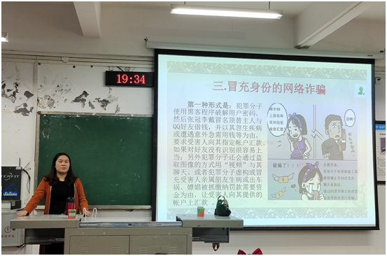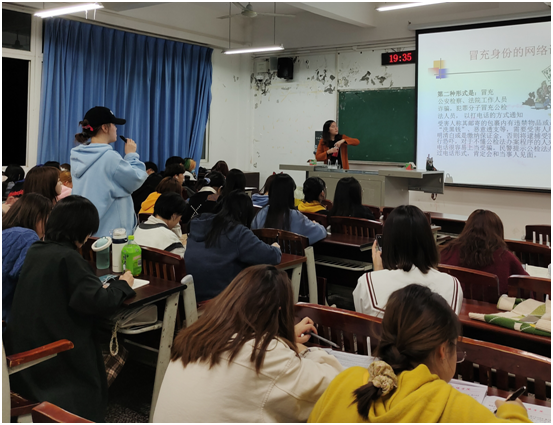针对当前青年大学生群体面对各类诈骗手段时普遍存在的防范意识差、辨识能力弱、应对水平低的现象,陈老师通过典型案例并结合自身从教多年掌握的学生被骗事件,给同学们科普各类诈骗手段,并提出忠告:牢固树立正确的消费观和金钱观,不贪图小便宜,理性消费;学习掌握安全知识,增强防范意识,了解我们身边常见的各种诈骗行为,增强辨识能力。