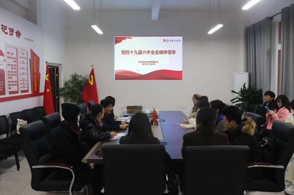 为深入学习贯彻党的十九届六中全会精神,全面系统学习领会全会精神的丰富内涵与核心要义,提高同学们的党性修养和理论水平,外国语学院于12月11日14:00在博学楼三栋315室,组织团学青年骨干集中学习党的十九届六中全会内容。学院党总支书记甘长银教授、副书记黄琰出席,团总支书记杨华主持会议。