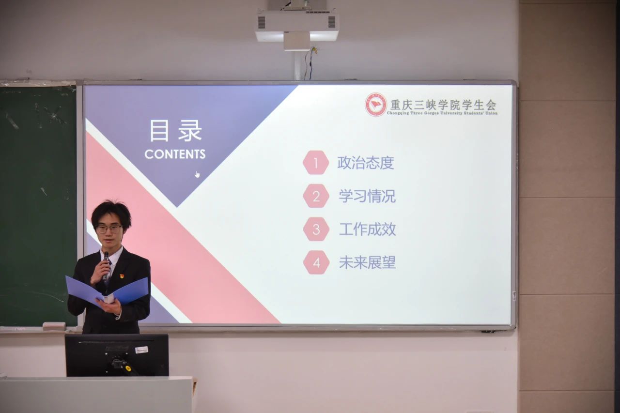 邓代平同学从政治态度、学习情况、工作成效、未来展望四个方面展开述职汇报。他积极在学生会中承担责任,推动组织改革创新,取得显著成效。