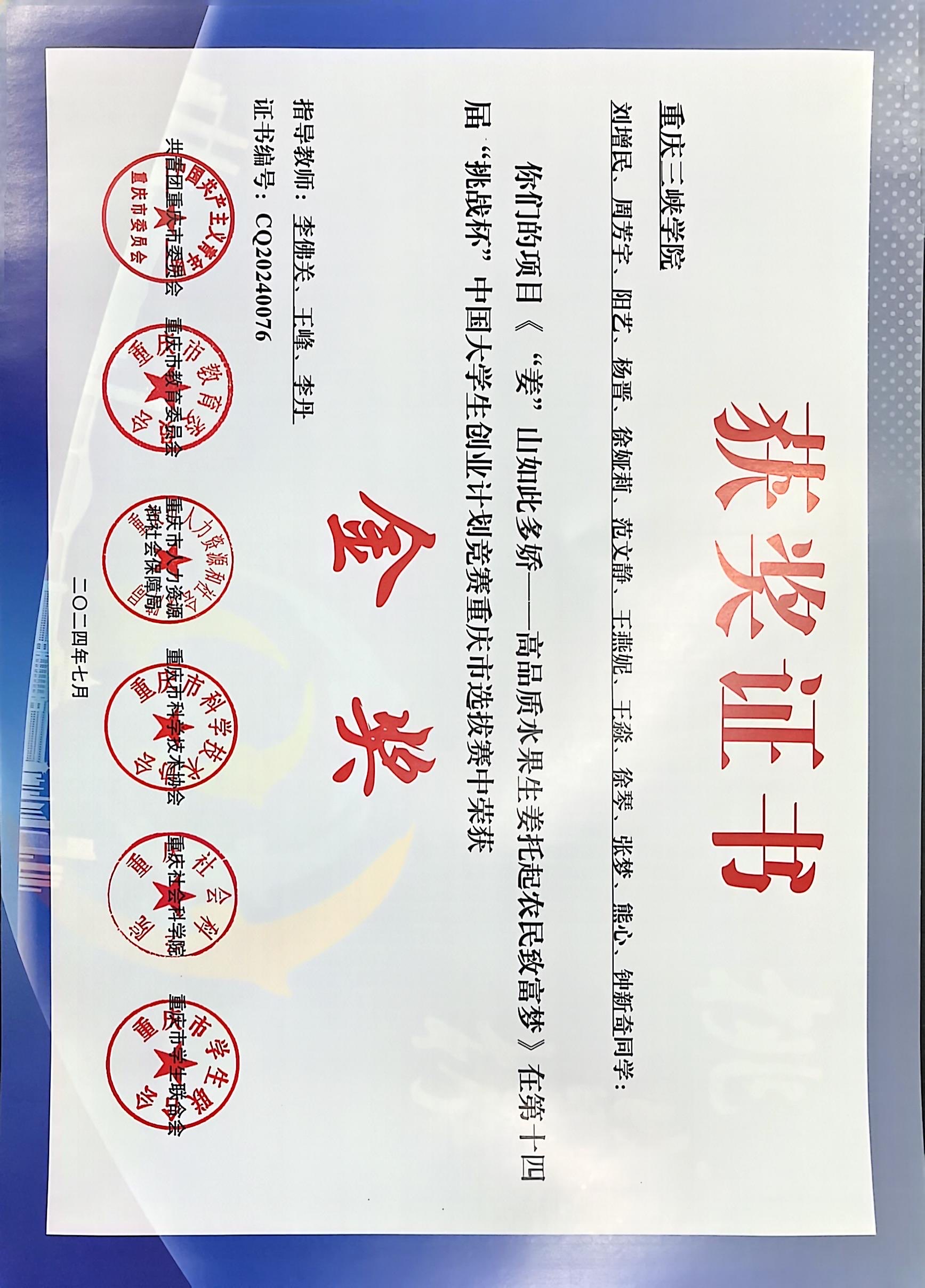第十四届“挑战杯”中国大学生创业计划竞赛重庆市选拔赛金奖
