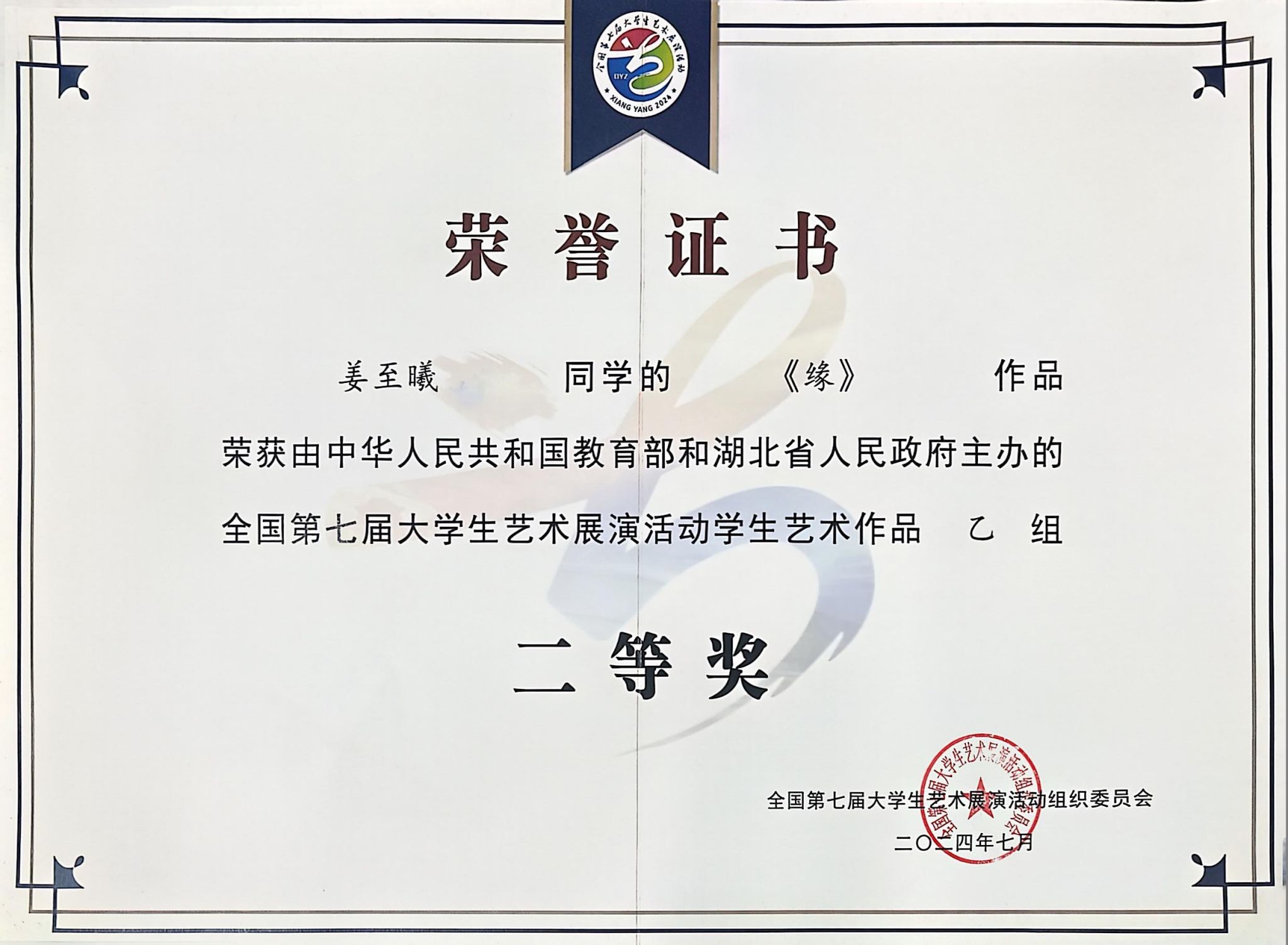 全国第七届大学生艺术展演活动学生艺术作品二等奖