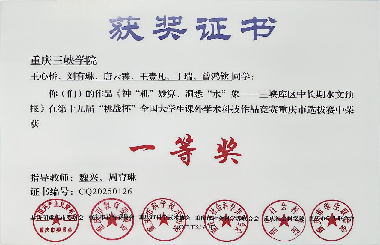第十九届“挑战杯”全国大学生课外学术科技作品竞赛重庆市选拔赛一等奖