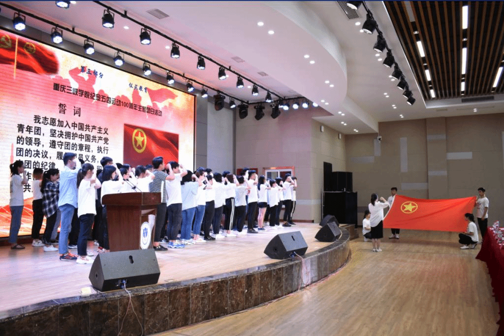 “仪式教育”环节,按照团中央关于团员发展的最新要求,本次符合条件的70名青年学生,在现场团旗映衬下庄严宣誓,光荣加入共青团组织;