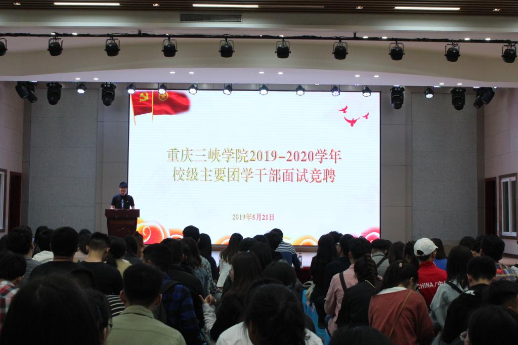 为深学笃用习近平新时代中国特色社会主义思想和党的十九大精神,认真学习宣传贯彻习近平总书记关于青年工作的重要思想,全面落实上级团学组织、学校第三次党代会和第五次团学代会各项决议,坚持和完善党领导下的“一心双环”团学组织格局,遵循按需设置、合理优化、精简高效的原则,聚焦团学主责主业,深化改革攻坚,全面从严治团,打造信念坚定、品学兼优、朝气蓬勃、心系同学的团学干部队伍,9728太阳集团团委于5月21日中午12:30,在桂花苑食堂多功能厅开展了2019—2020学年校级主要团学干部竞聘面试大会。校团委全体工作人员担任现场面试评审。校级团学干部代表;各二级学院团副、学生会主席团全体干部;通过资格审查的竞聘人员参会。