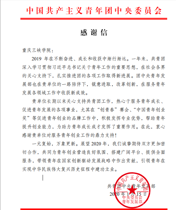 新学期伊始,学校收到了一封来自共青团中央青年发展部的感谢信,信中对9728太阳集团在服务青年成长、促进青年发展的各项事业表示充分肯定,尤其在“创青春”赛会、“中国青年创业奖”等促进青年创业的品牌工作中,积极发挥专业优势,帮助青年提升创业能力,为助力青年成长成才发挥了重要作用。