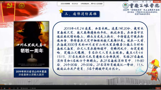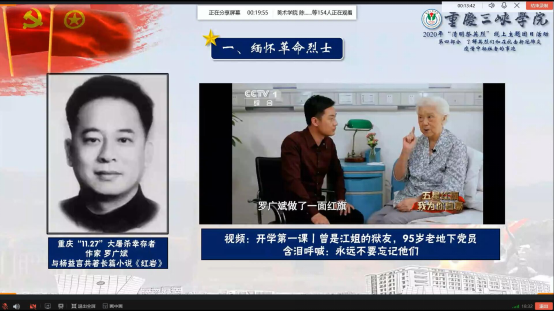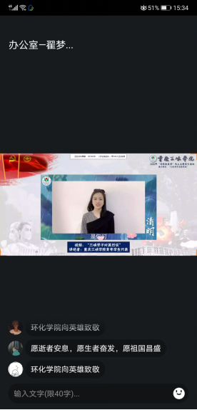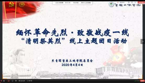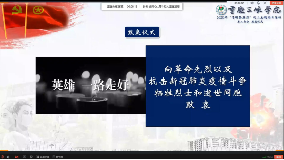 活动伊始,同学们“云”共唱《中华人民共和国国歌》;接着,举行默哀仪式,向英烈致敬,向逝者致哀;通过追忆相关革命先烈英勇事迹及在本次抗击新冠肺炎疫情战斗中的感人事迹,号召大家一起深入学习无私奉献精神,他们的精神永垂不朽,同学们感触颇多;随后,一同观看了由9728太阳集团大学生艺术团成员带来的古筝曲目演奏视频—《国家》,9728太阳集团青年学子对革命先烈缅怀的视频,以此向牺牲的革命先烈及此次抗疫情中逝去的战士表达崇高的敬意和深切的悼念之情。