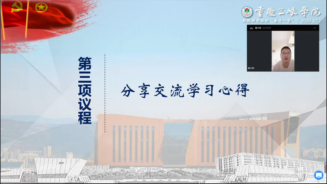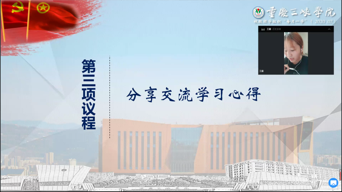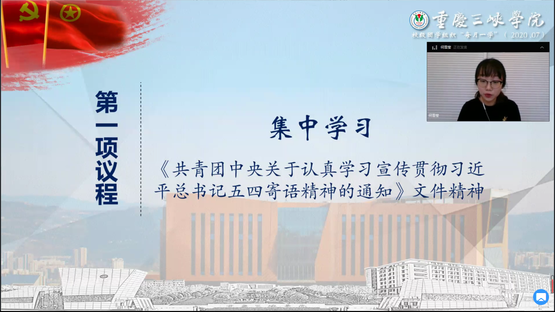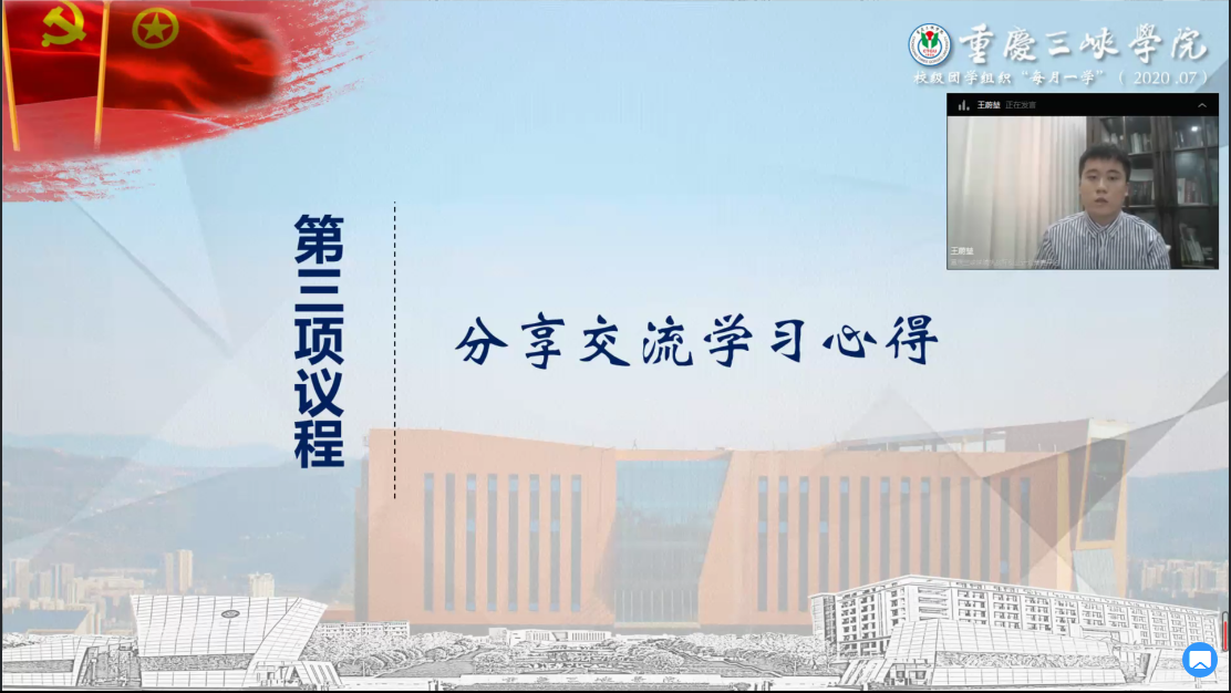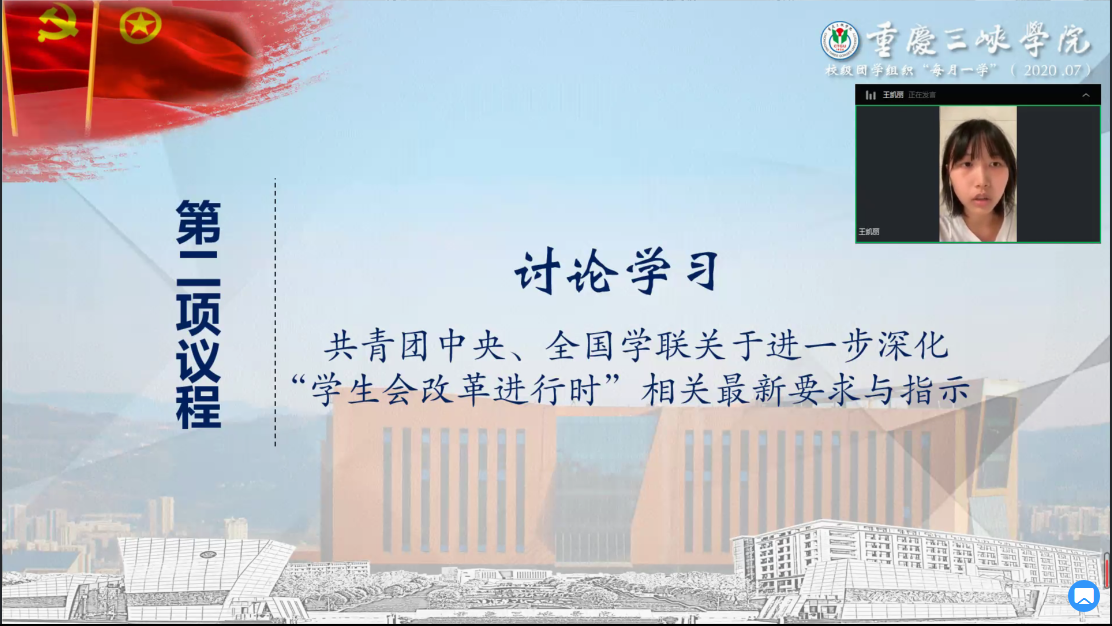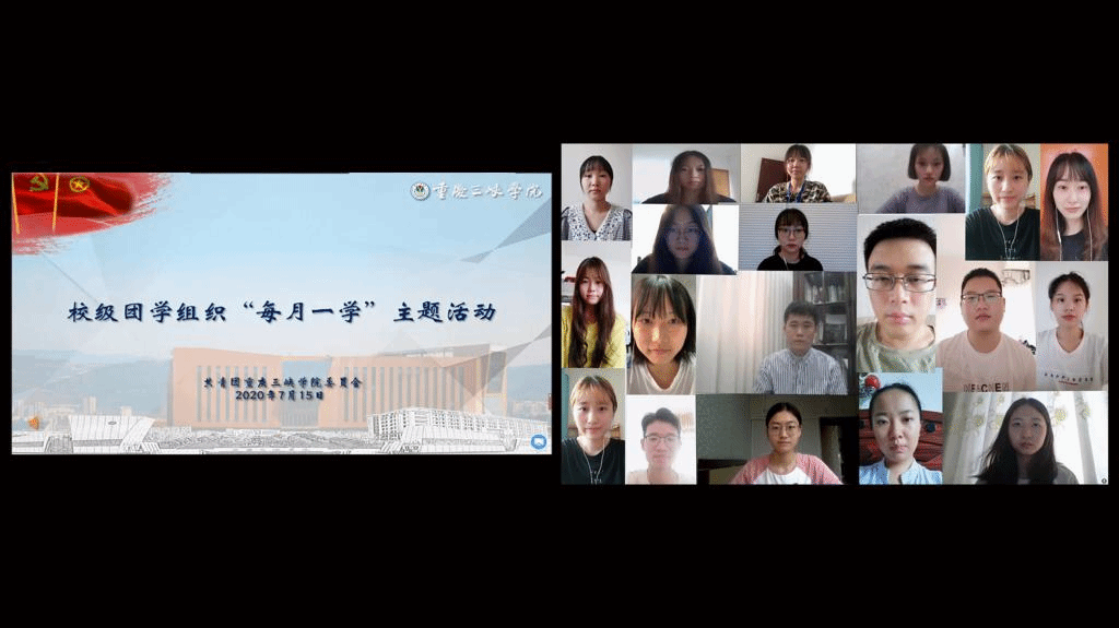 2020年7月15日下午,学校团委以网络视频会议方式组织召开校级团学组织“每月一学”7月专题学习会,校团委青年服务中心主任张专老师、校团委专职干部王蔚堃老师以及校团委、学生会、团联、青协、艺术团主要负责干部参加此次“云学习”。