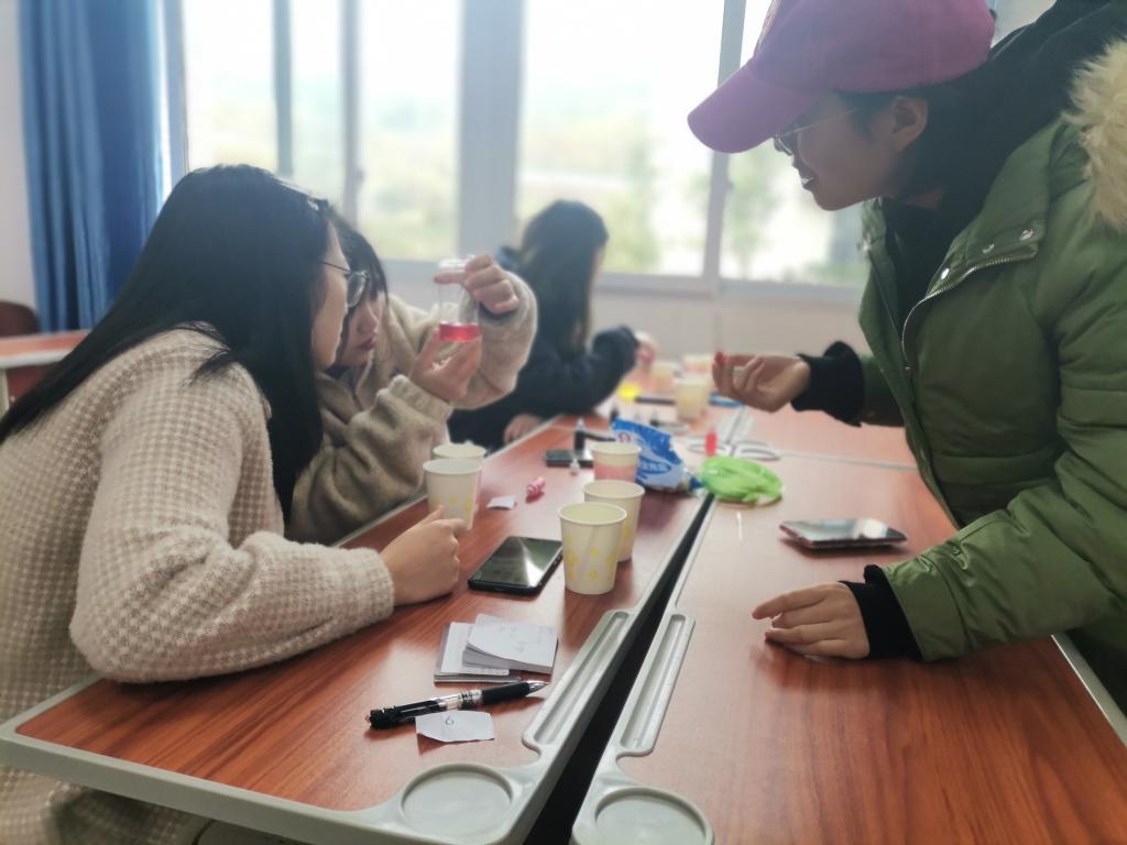 决赛阶段,专业组和非专业组分别以做实验的形式进行。专业组实验在慎思楼四栋318开展,参赛选手们在专业老师指导下进行长江水中金属离子的分离与鉴定实验,选手们积极讨论、确定实验步骤、撰写实验报告,然后由指导老师进行评分;非专业组实验在慎思楼五栋314开展,参赛选手通过饱和盐溶液和色素进行趣味实验——瓶子里的彩虹,并对作品进行装饰,评委根据其美观度、演说表达以及实验结果进行评判。