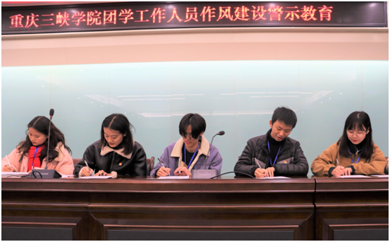 同时,校学生会主席团成员薛诗雨同学作为领誓人带领全体人员重温入团誓词;校学生会执行主席杨怡等六位学生会工作人员代表上台签署《重庆三峡学院改进作风服务同学承诺书》;会后,重庆三峡学院学生会全体工作人员依次签署。
