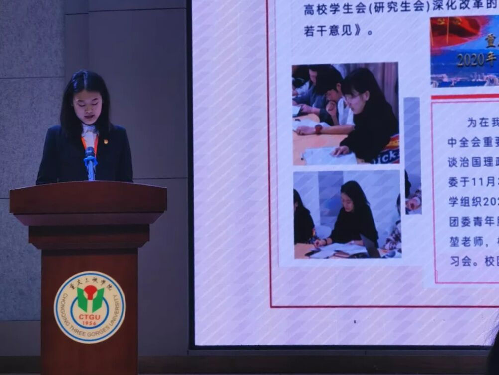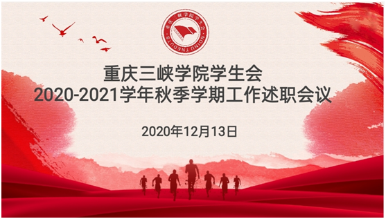 为深入学习贯彻习近平总书记致全国学联二十七大贺信精神,进一步落实全国学联二十七大会议相关精神,根据《关于高校学生会(研究生会)述职评议会的工作指引(试行)》《重庆三峡学院学生会(研究生会)深化改革实施方案》等文件精神,2020年12月13日上午,重庆三峡学院学生会在山顶多功能厅召开2020—2021学年度秋季学期工作述职会议。校团委副书记王峰老师、学生处思想政治教育中心副主任蔡贞老师出席本次会议,校、院两级学生会主要工作人员和普通青年学生代表共同参与本次会议。