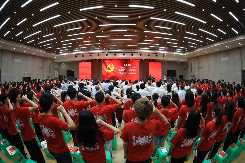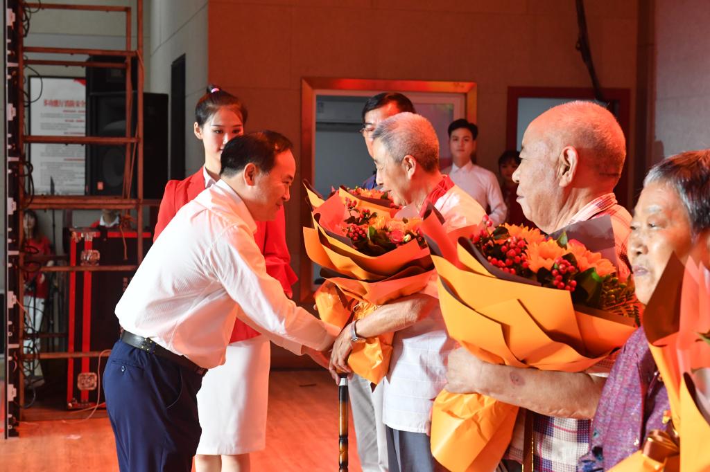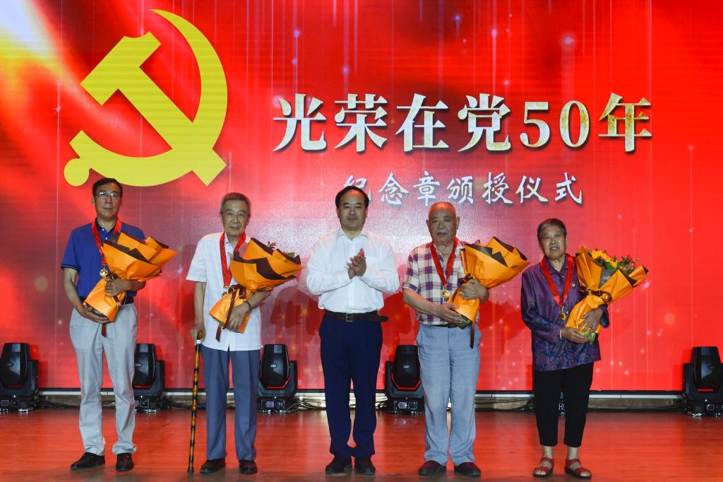 特别环节:邀请王自强、刘坤、易忠玖、孙先华等四位学校退休老党员同志到场,党委书记李廷勇同志为他们颁授“光荣在党50年”纪念章,并带领全场观众庄严重温入党誓词,大家跟着老党员的步伐,回顾中国共产党百年光辉历史,珍视百年来气势恢宏的中国画卷。