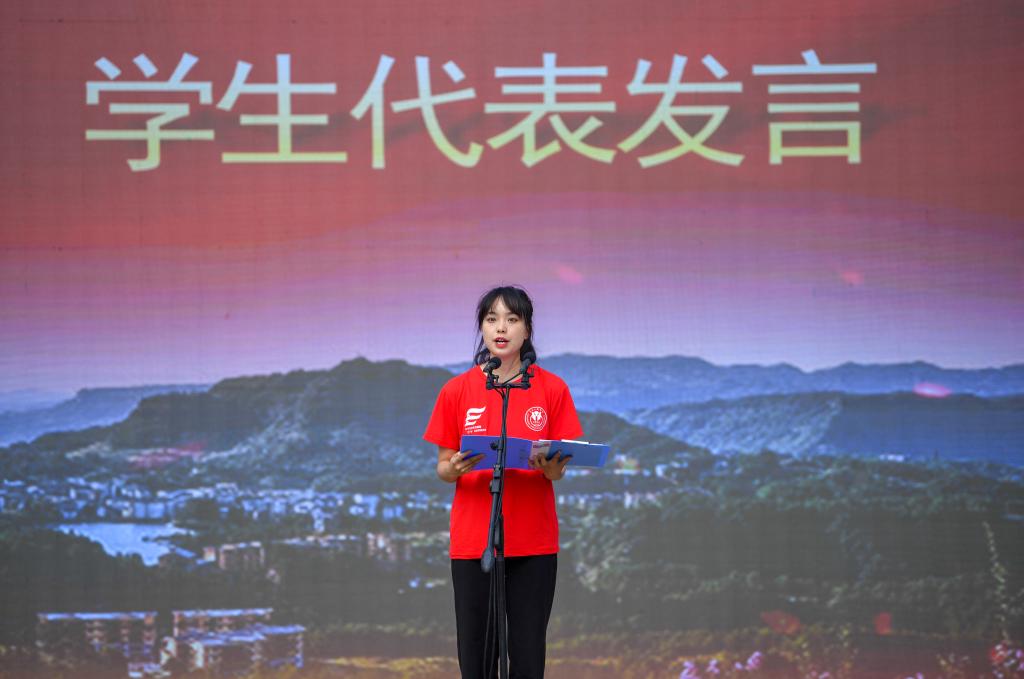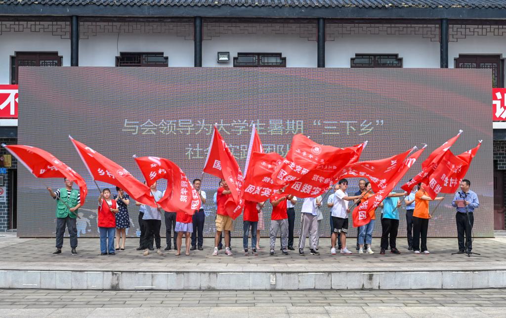 蒋艺义在仪式上致辞。她表示,今天落成的乡村振兴社会实践基地和开展的暑期“三下乡”社会实践活动,是坚决贯彻落实中央、市委关于乡村振兴的工作要求、巩固拓展脱贫攻坚成果同乡村振兴有效衔接的有力举措,也是校地携手共建助力乡村振兴的积极探索,更是引导广大青年大学生投身广阔农村、推动自身发展的重要平台。李廷勇在讲话中对参加社会实践的大学生提出希望,要在“田间地头”培育“国之大者”的根脉、读好“为国为民”的书籍、唱响“青春奋斗”的歌谣,向黄文秀、毛相林、霍仕平等同志学习,在实践活动中深化理论知识,做到知行合一。