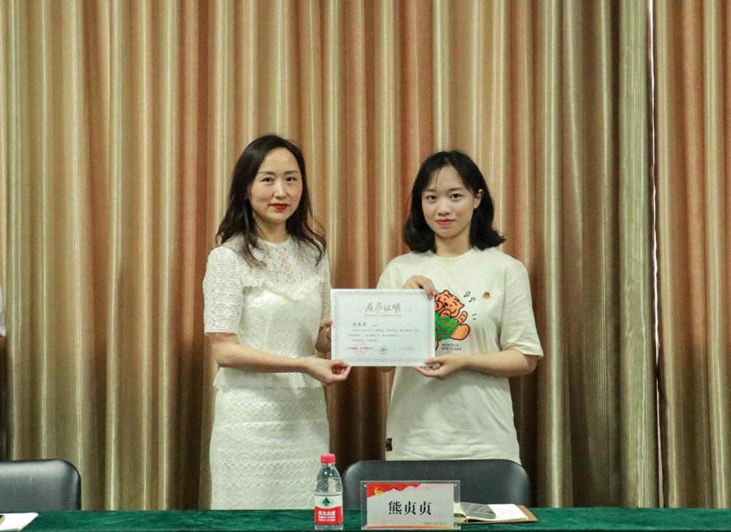 会议第二项,由校团委书记熊贞贞老师为2021-2022学年度校级团学骨干代表颁发履历证明并进行合影留念。
