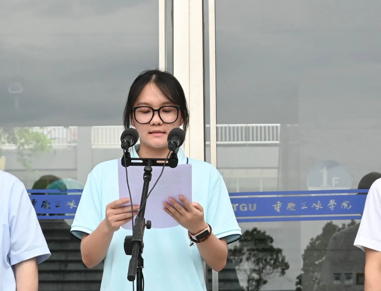 学生代表罗覃琴发言并承诺:“三下乡”实践活动过程中定会牢记使命,履职尽责,圆满完成各项计划,在活动中,不断提高个人素质,以饱满的精神面貌将自己学知识服务于社会与人民,展现重庆三峡学院学子青春力量,为中国式现代化挺膺担当。