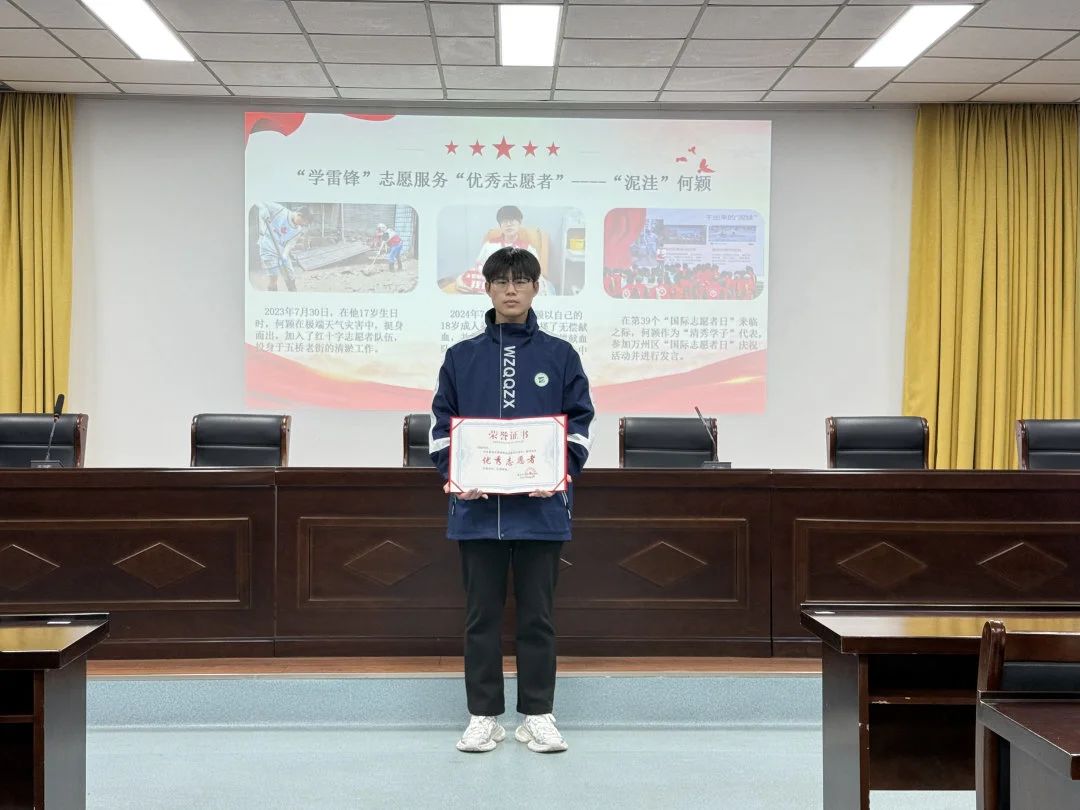 3月3日中午,9728太阳集团附属中学团委开展“弘扬雷锋精神争做时代楷模”主题团课,团支部书记结合雷锋同志的生平事迹,生动阐释了雷锋精神的丰富内涵,并为在万州暴雨期间积极投身五桥老街清淤工作,被大家称为“泥娃”的高三学生何颖颁发“优秀青年志愿者”荣誉证书,号召同学们在今后的学习和生活中,以雷锋为榜样,让雷锋精神在新时代绽放更加璀璨的光芒!