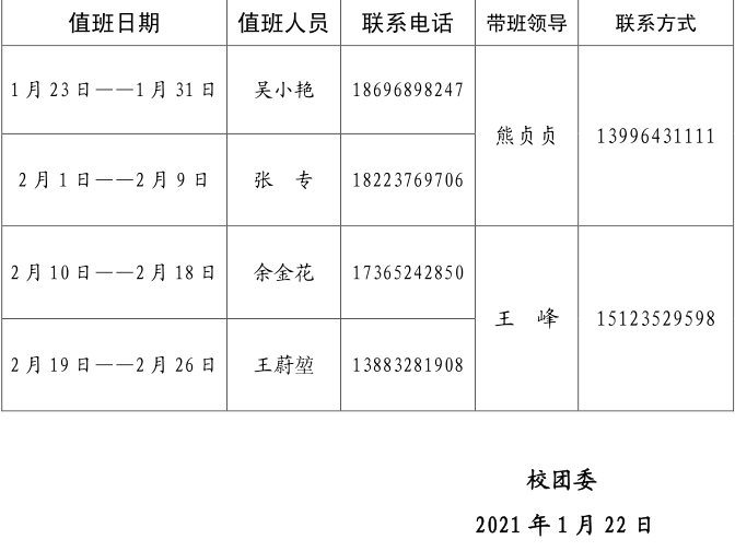 校团委2021年寒假期间值班安排表